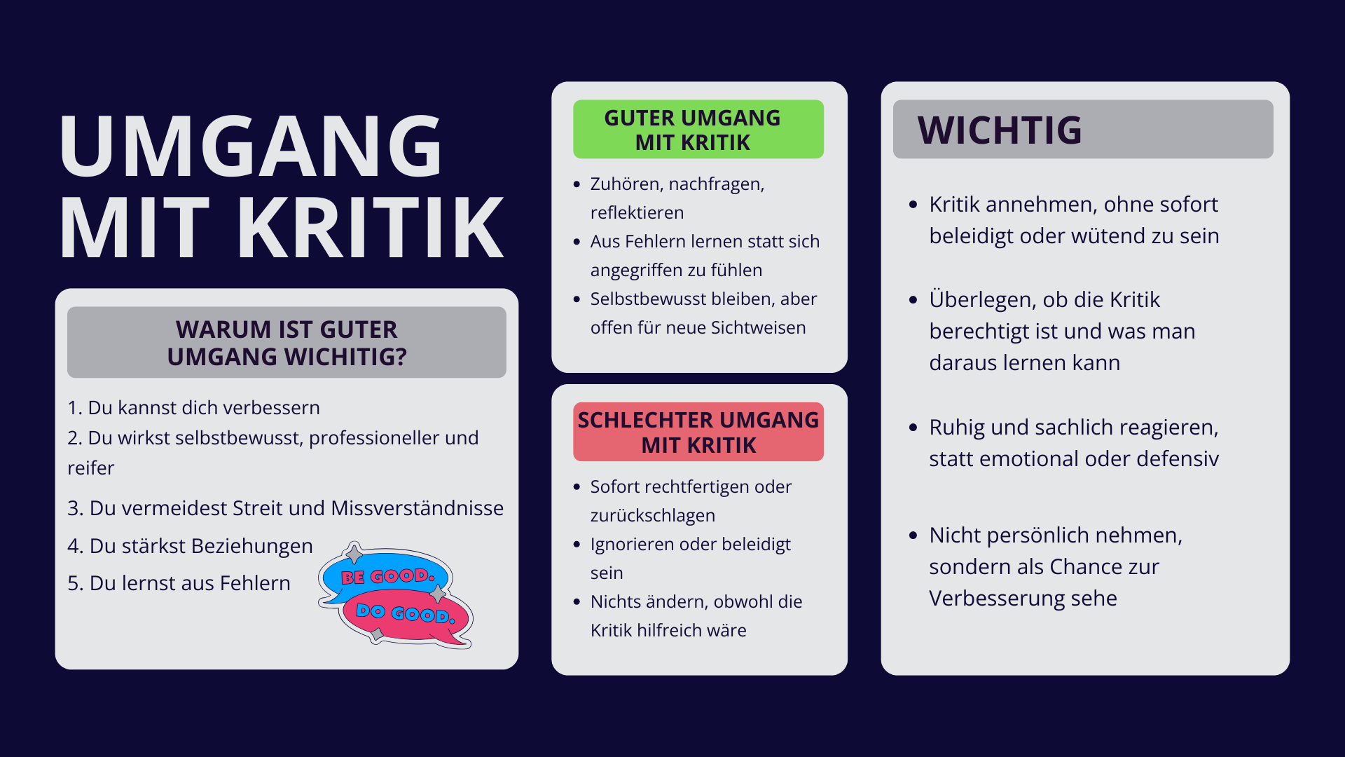 Der „Umgang mit Kritik“ beschreibt, wie man reagiert, wenn jemand einem Rückmeldung gibt – besonders wenn sie negativ oder kritisch ist.